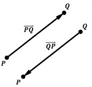 La primera representación de vectores es como un segmento de recta dirigido desde un punto \(P\) hasta un punto \(Q.\) donde \(P\) es el punto inicial (cola) y \(Q\) es el punto final (punta). Así en la figura de la izquierda el vector \( \vec{PQ}\neq\vec{QP}\) ya que tienen igual dirección (ángulo medido al eje \(x\) positivo), pero sentido opuesto.