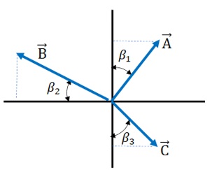 Adicion de vectores por componentes. Dada la figura de la izquierda (dibujo no está a escala), donde \(A=20.0m,~ B=22.0m,~C=15.0m,\) \(\beta_1={30.0°},\) \(\beta_2={35.0°}\) y \(\beta_3=40.0°\) determinar la suma de los vectores en cada caso. \begin{align} 1.&~~\mathbf{\vec{u}}=\mathbf{\vec{A}}+3\mathbf{\vec{B}}\\ 2.&~~\mathbf{\vec{v}}=2\mathbf{\vec{A}}-5\mathbf{\vec{C}} \end{align}
