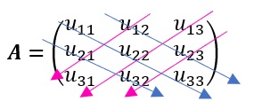 Las diagonales en azul son las diagonales primarias, mientras que las diagonales en rosa son las secundarias. La diagonal principal es aquella que pasa por los elementos \(u_{11},u_{22},u_{33}\) mientras que la diagonal secundaria es aquella que pasa por los elementos \(u_{13},\ u_{22},\) y \(u_{31}.\)