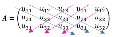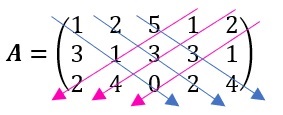 añadir las pimeras dos filas para una matriz \(5\times3\) o las primeras dos columnas, para una matriz \(3\times5\) (en este caso), trazando diagonales primarias y secundarias como sigue,