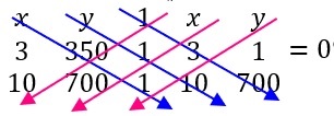$$\left|\begin{matrix}x&y&1\\x_1&y_1&1\\x_2&y_2&1\\\end{matrix}\right|=\left|\begin{matrix}x&y&1\\3&350&1\\10&700&1\\\end{matrix}\right|=0$$
