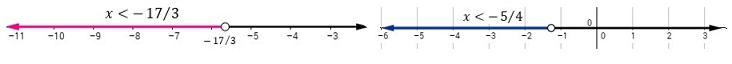 $$\begin{array}{c |c} \mathrm{Solución}~ 1: & \mathrm{Solución}~ 2:\\ 3x+5<-12 & -8x > 13-3\ \ \mathrm{Trasposición.}\\ 3x<-12-5\ \ \ \mathrm{Trasposición} & -8x > 10\ \ \ \ ~~~~~~ \mathrm{Simplificando}\\ 3x<-17\ \ \ \ ~~~~~~ \mathrm{Simplificación}& x<\frac{10}{-8}\ \ \ \ ~~~~~~~~~ \mathrm{Despejando}\\ x<-\frac{17}{3}\ \ \ \ ~~~~~~~ \mathrm{Despejando}~ x.& x<-\frac{5}{4}\ \ \ \ \ ~~~~~~~\mathrm{Despejando} \end{array}$$