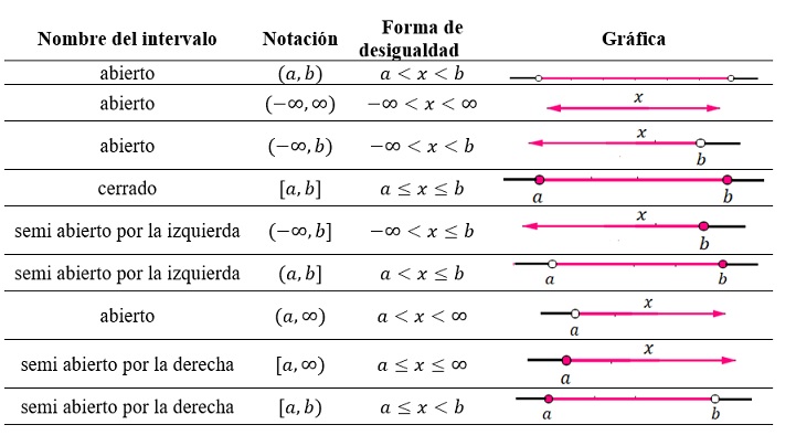 A partir de los conceptos de infinito e inecuaciones simultaneas se pueden escribir intervalos abierto y semi abiertos mediante el uso de la notación de desigualdades finitas o infinitas como se muestra en la tabla siguiente.