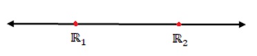 Gráficamente en la recta real se tiene que, para los reales \(\mathbb{R}_1\) y \(\mathbb{R}_2\) es mayor, el que está ubicado a la derecha del otro. De manera equivalente decir, que \(\mathbb{R}_1<\mathbb{R}_2\) implica que \(\mathbb{R}_2>\mathbb{R}_1.\) En la gráfica de más abajo \(\mathbb{R}_1<\mathbb{R}_2.\)