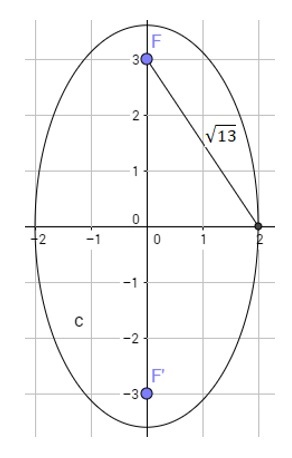 Ejercicio 2. Determinar una ecuación de la elipse con centro de centro \(C(0,0)\), si se sabe que la longitud del eje mayor es \(2\sqrt{13}\) y la del eje menor es \(4\), donde su eje focal está sobre el eje de ordenada. Además, escribir las coordenadas de los focos y los vértices.