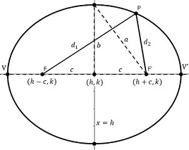 En la figura se muestra una elipse de centro \((h,k)\) cuyos focos \(F\) y \(F'\) son los puntos \((h\pm c,k)\). De la definción, a medida que un punto se mueve sobre la elipse \(d_1+d_2=d\) (un valor constante). Para facilitar el análisis algebraico se escoge \(d=2a\).