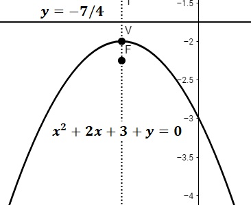 Dada la parábola \(x^2+2x+3+y=0\) determinar hacia donde abre, el vértice, el foco, la directriz y el eje de simetría.