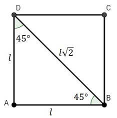 Para las funciones trigonométricas de \(45°\) se parte de un cuadrado de longitud de lado igual a \(l\), trazando una diagonal, que por ser un cuadrado es bisectriz quedando así determinada la figura de la izquierda de donde,