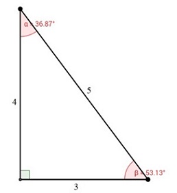 Note de la figura de la izquierda que los valores de los ángulos alfa y beta no corresponden a valores exactos (están redondeados a la centésima) para tener \(\alpha=36.87°\) y \( \beta=53.13°\), así que lo que presentan estos autores es una aproximación en la cual los ángulos alfa y beta son redondeados aún más haciendo \(\alpha=37°\) y \(\beta=53°\), bajo este redondeo se escriben las funciones trigonométricas para estos ángulos con los valores siguientes.\begin{array}1