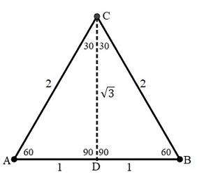 Como construcción auxiliar, en el triángulo \(ABC\) se muestra el segmento \(\overline{CD}\) que por ser el triángulo equilátero es bisectriz, mediatriz, mediana y altura, del teorema de Pitágoras \(\overline{CD}=\sqrt3\). Debidio a que el valor de las funciones trigonométricas carece de unidad de medida, solo es necesario escribir los números.
